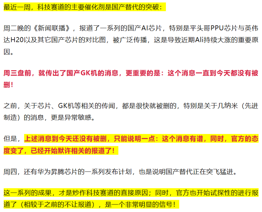 同时,从市场的角度来看,是对于科技板块抱团对象的切换:前段时间抱团AI算力为主,资金恐高之后,最近又开始抱团芯片半导体为主了!